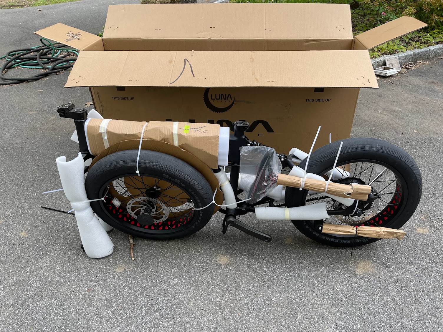 One thing I really like about Luna’s packaging (for all of their bikes) is the liberal use of cardboard as padding. Only a few pieces of plastic protection and zip ties (15?) are used and that waste can be held in one hand. The rest is recyclable paper products which feels very eco-friendly.